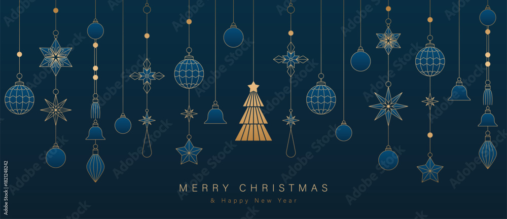 Fototapeta na wymiar - Christmas vector greeting card illustration with blue background, gold hanging ornaments and stars for Happy New Year — elegant festive design.