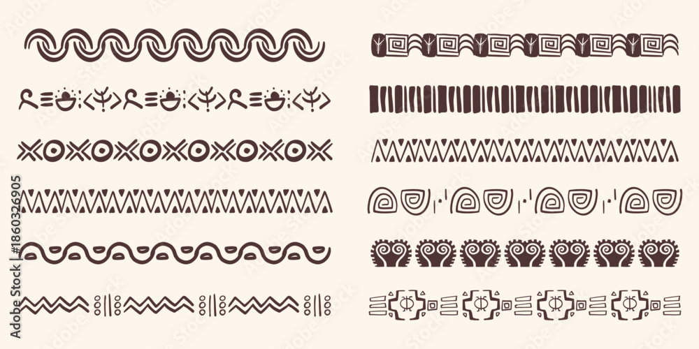 Fototapeta na wymiar - Set african tribal ethnic border, divider doodle hand drawn from geometrical shapes isolated. Boho motif scandinavian srtoke, traditional native decor..