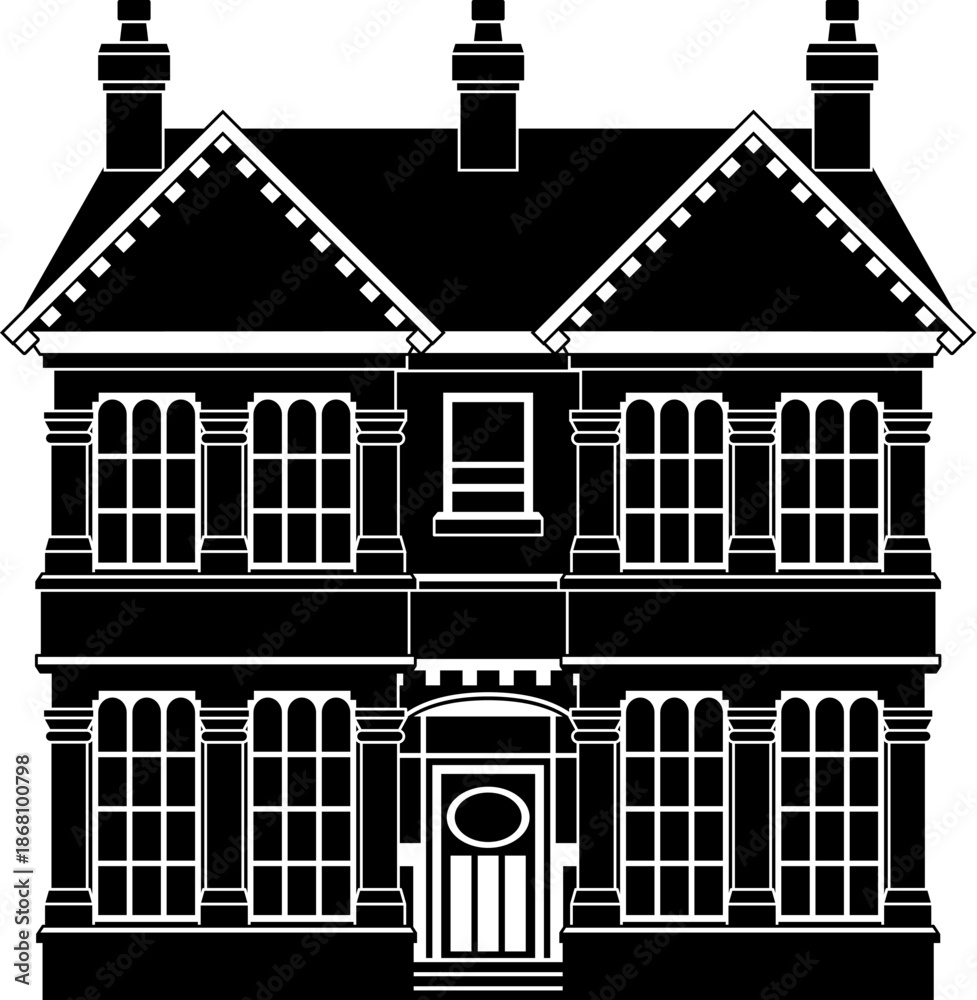 Fototapeta na wymiar - Victorian silhouette old English house building. Georgian mansion manor style homes. Vintage British architecture facade illustration..