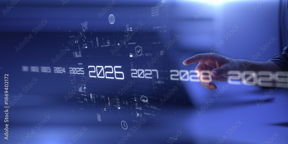 Fototapeta na wymiar - Man presses holographic 2026 year button. Concept of new year, annual plan, growth strategy, business planning, recap, investment trends and strategy road map..