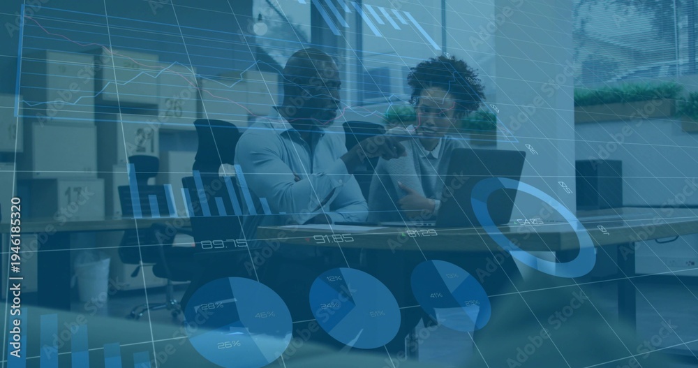 Fototapeta na wymiar - Pointing two colleagues in business attire reviewing laptop data at meeting table, with charts.