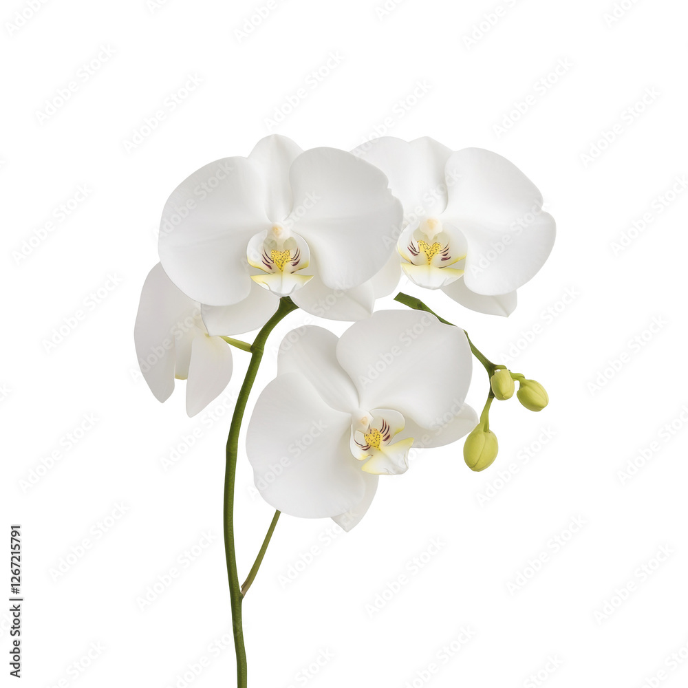 Fototapeta na wymiar - A single white orchid with a yellow center sits on a white background. The flower is the main focus of the image, and its simplicity and elegance convey a sense of calm and tranquility.