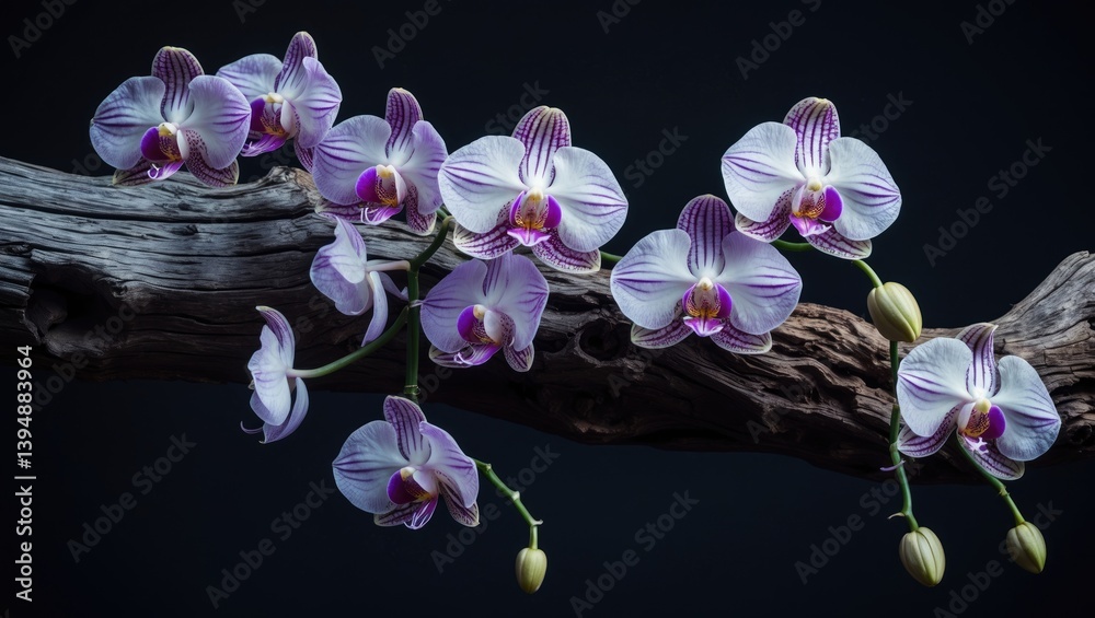 Fototapeta na wymiar - Close-up shot of flowering tropical epiphytic orchid species resting on wood with a black backdrop.