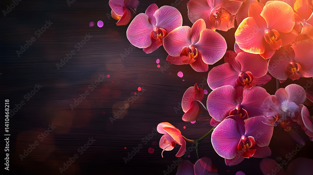 Fototapeta na wymiar - Vibrant pink orchids gracefully bloom against a dark wooden backdrop..