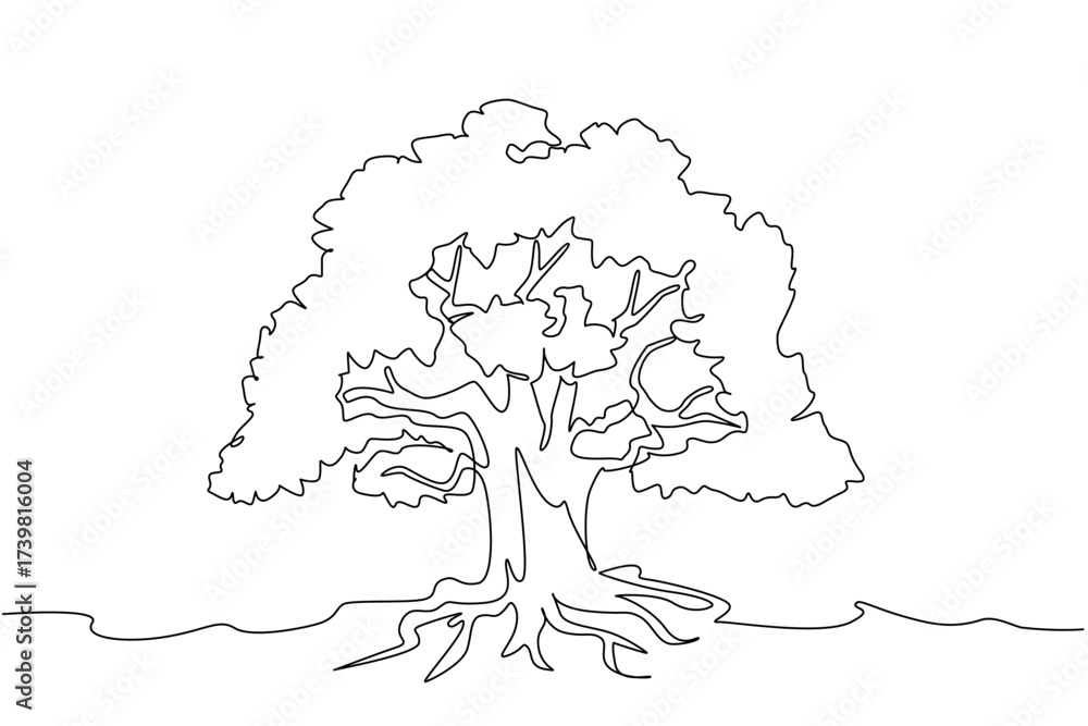 Fototapeta na wymiar - Single continuous line drawing large tree with shady leaves and branched roots. Fertile soil helps trees grow until they are shady. Dense banyan tree. Tree Concept. One line design vector illustration.