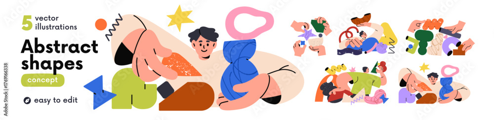 Fototapeta na wymiar - People with abstract shapes set. Information exchange, sharing and building opinions concept. Creative ideas flow, solving tasks, communication. Flat vector illustration isolated on white background..