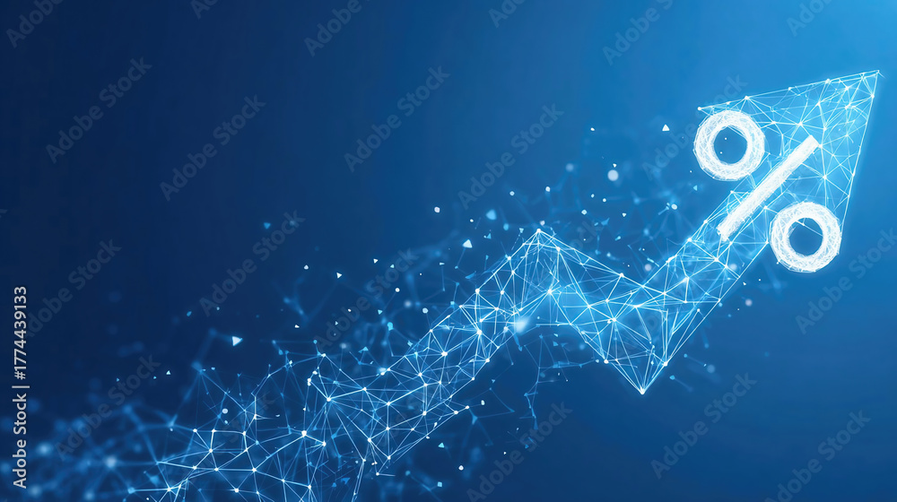 Fototapeta na wymiar - Abstract digital arrow up and percent polygonal symbols on technology blue background. The growth arrow consists of polygons, lines, and connected dots.