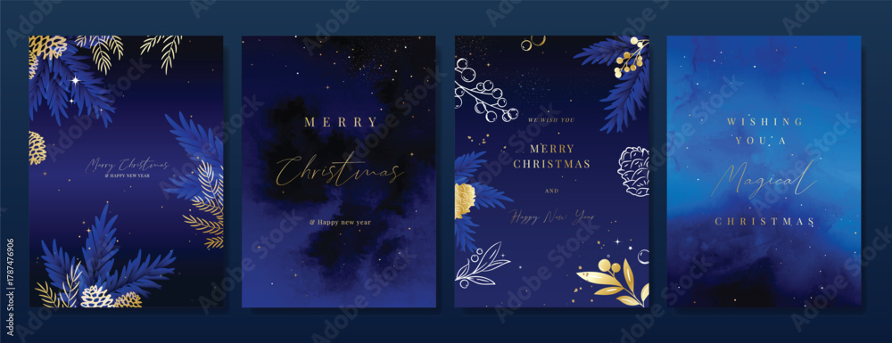 Fototapeta na wymiar - Christmas Luxury gold invitation card design vector. Christmas pine leaves, snowflake with gold foil and spot texture on navy blue background. Design illustration for cover, print, poster, ads..