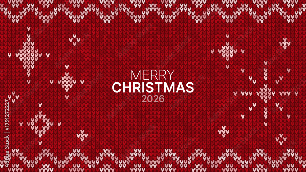 Fototapeta na wymiar - Red knitted background with Merry Christmas 2026 text. Ugly sweater texture with winter snowflake pattern for holiday banner or greeting card..