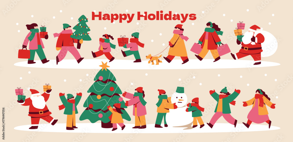 Fototapeta na wymiar - Illustration set of people enjoying the winter holidays and Christmas.