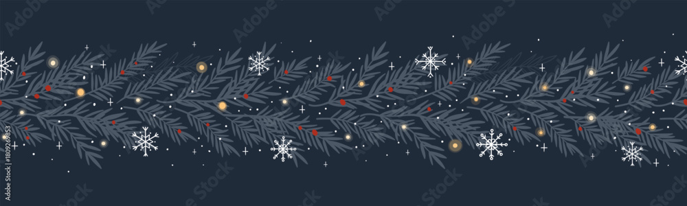 Fototapeta na wymiar - Lovely hand drawn horizontal seamless borders with winter branches, Christmas design, great for decorations, prints, cards - vector design.
