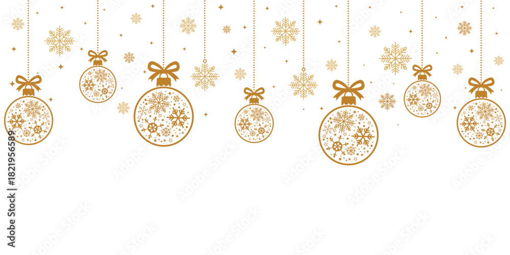 Fototapeta na wymiar - Elegant Christmas header or banner design featuring a line of hanging golden/bronze ornaments and snowflakes along the top edge. The festive border on a white background leaves large copy space below .