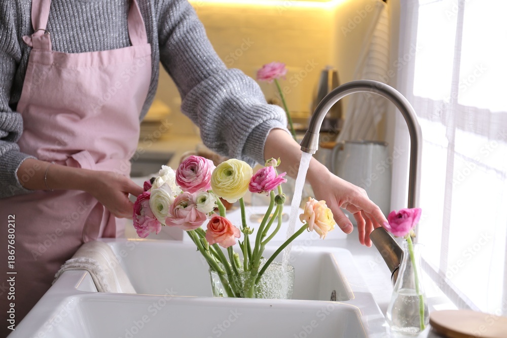 Fototapeta na wymiar - Woman taking care of cut fresh ranunculus flowers in kitchen, closeup.