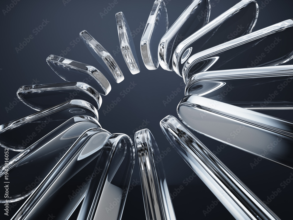 >Fototapety na wymiar>Wybrane motywy - zobacz więcej !>Owoce>Liquid glass transparent circle array on dark 3d background. Abstract render ring, radial circular pattern of clear rectangle plate shapes, crystal rounded lines with light refraction. 3D illustration