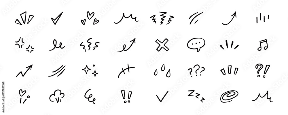 >Fototapety na wymiar>Wybrane motywy - zobacz więcej !>Owoce>Line element movement hand drawn set. Line doodle sketch hand drawn movement effect icon pencil brush chalk stroke. Cute comic manga emoji emotion stars sparkle heart expression. Vector illustration