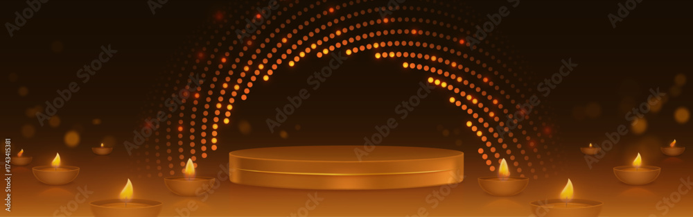 Fototapeta na wymiar - Golden podium with Diwali lantern flames and dotted arch backdrop for festive product display. Candles surrounding cylindrical platform with glowing decorative elements. Traditional celebration scene.