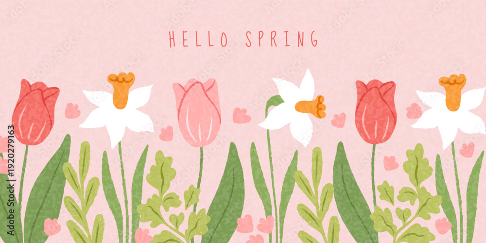 >Fototapety na wymiar>Wybrane motywy - zobacz więcej !>Paryż>Spring horizontal banner with hand drawn bloom flowers, tulip and daffodil drawing charcoal. Perfect for spring holidays, Mother's Day, Easter, Women's Day. Floral vector beautiful background.