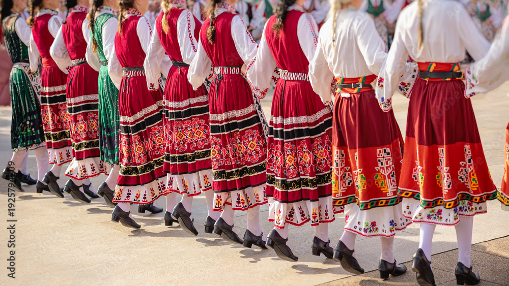 >Fototapety na wymiar>Wybrane motywy - zobacz więcej !>Paryż>Women in traditional embroidered folk dresses dancing in synchronized movement at cultural festival. Bulgaria heritage, national identity, folk horo dance tradition, artistic craftsmanship of region