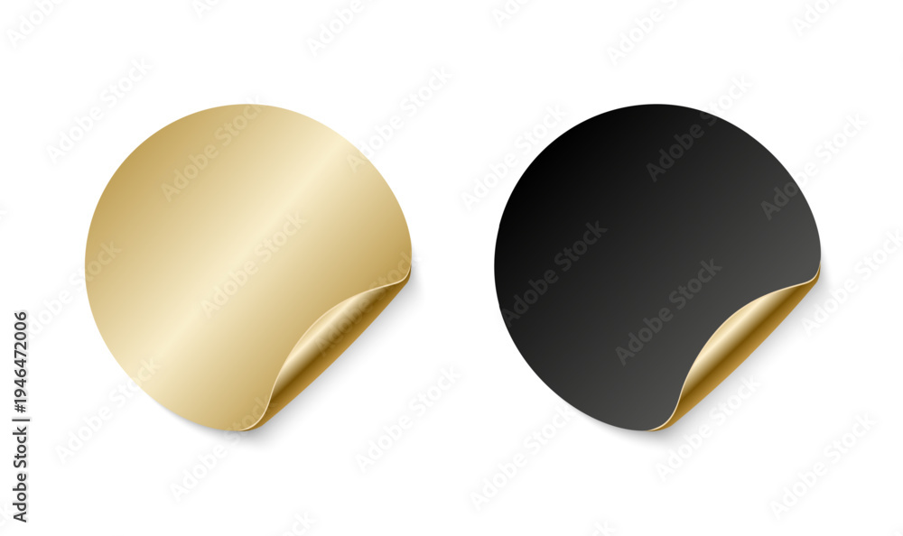 Fototapeta na wymiar - Gold and black glued round stickers with curled corner, glossy adhesive labels isolated on white background, premium badge design elements for branding, packaging, promotions, and product highlights.
