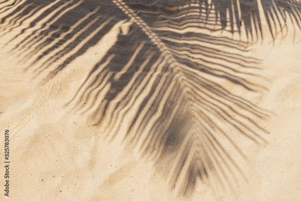 Fototapeta na wymiar - Tropical beach sand with shadows of coconut palm tree leaves. Travel and vacations concept background..
