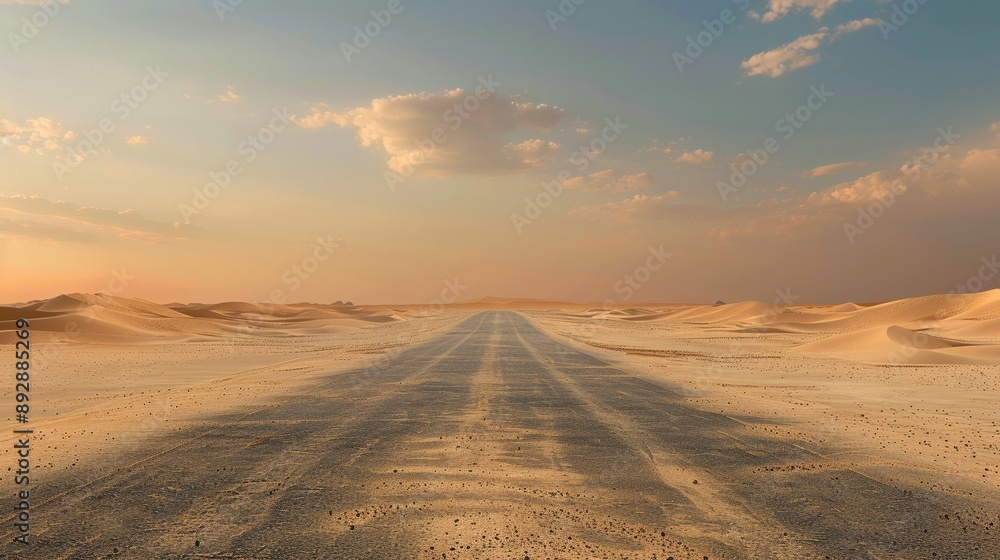 Fototapeta na wymiar - Highway in the desert, sand dunes, heatwaves, barren landscape.