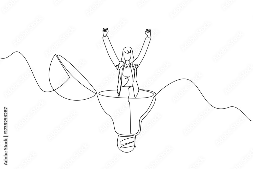 Fototapeta na wymiar - Continuous one line drawing a businesswoman stands in lightbulb with the top open raising hands. Get out of the erratic mind. Idea. National Creativity Day. Single line draw design vector illustration.