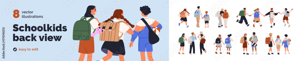 Fototapeta na wymiar - Back to school set. Rear view of kids students holding hands, walking together. Children groups, classmates, friends with backpacks from behind. Flat vector illustration isolated on white background..
