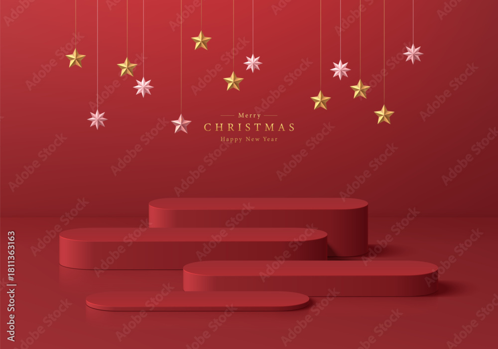 Fototapeta na wymiar - Red round product podium 3D background with empty space. Christmas new year theme. Abstract composition minimalist design. Studio display showroom stands pedestal, Fashion stage showcase mockup scene..
