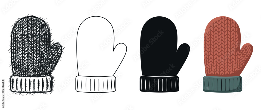 Fototapeta na wymiar - Set of four winter mitten illustrations in different artistic styles including hand-drawn sketch, simple outline, solid black silhouette, and a colorful flat vector design.