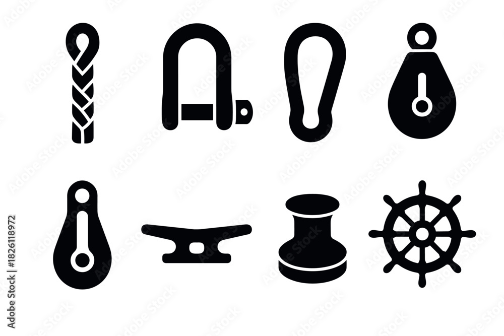 Fototapeta na wymiar - Nautical equipment icons: flat silhouette collection for marine themes.