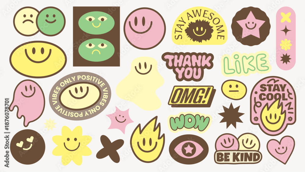 Fototapeta na wymiar - Colorful stickers with smiley faces, stars, and positive messages like 'Stay Awesome' and 'Be Kind' Bright, cheerful, and positive vibes throughout Funky stickers, vector set.