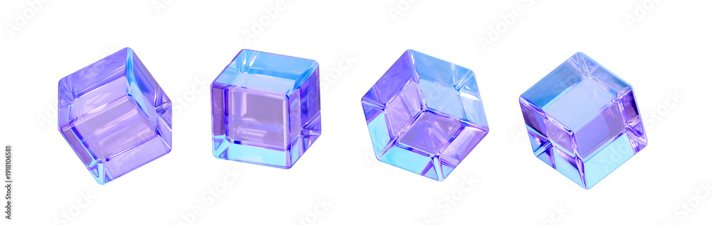 Fototapeta na wymiar - Set of 3D glass cubes with holographic iridescent gradient, futuristic Y2K aesthetic transparent crystal blocks, glossy purple and blue geometric square shapes .