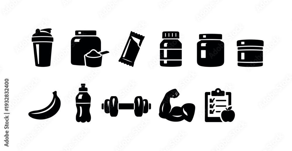 Fototapeta na wymiar - Nutrition and fitness solid icon set. health, exercise, and supplement icons collection.