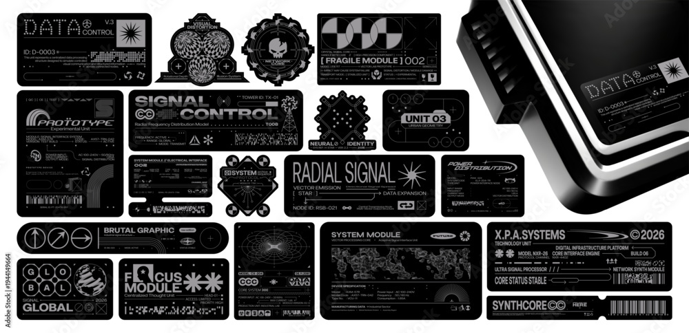 Fototapeta na wymiar - Futuristic tech label sticker pack collection. Cyberpunk UI interface elements, digital system modules, data control panels and industrial barcode graphics. Vector set.