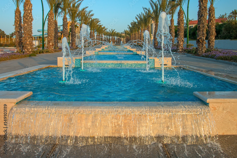 Fototapeta na wymiar - Ashkelon seaside park fountains colored evening light.