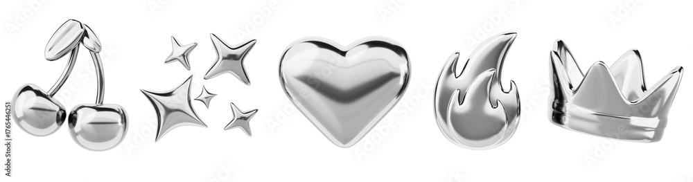Fototapeta na wymiar - 3d set of liquid chrome y2k shape render icon. Silver metal crown, cherry, heart, flame and stars in retro futuristic aesthetic style. Abstract design elements of aluminum or platinum.