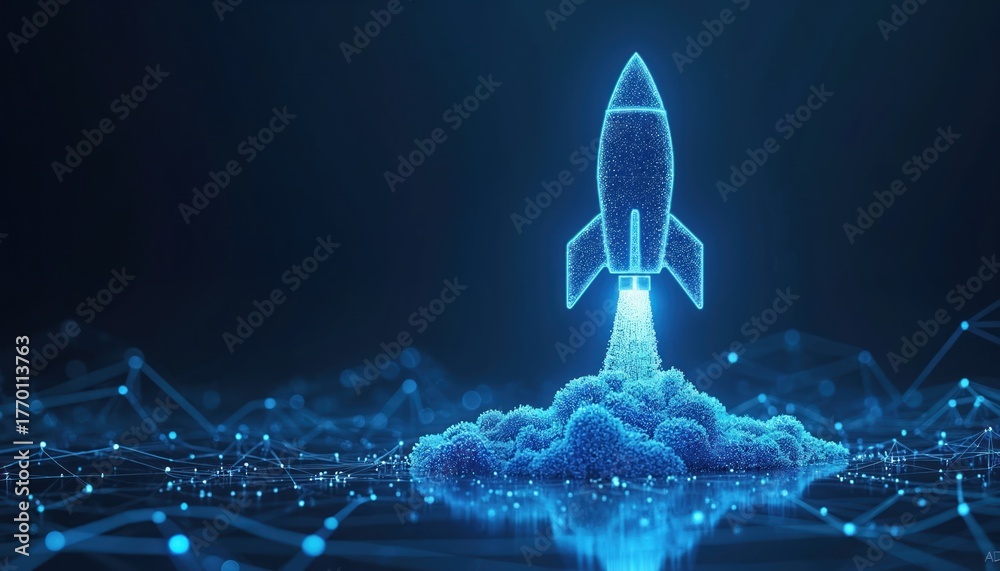 >Fototapety na wymiar>Wybrane motywy - zobacz więcej !>Pod palmami>Digital illustration of rocket launch on dark blue tech background. Glowing connected dots, lines represent rapid growth concept. Low poly wireframe art digital growth with arrows up, abstract