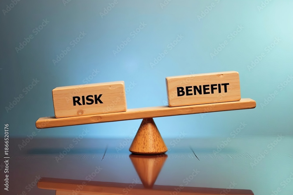 Fototapeta na wymiar - Perfectly balancing risk and benefit on a seesaw: wooden blocks against a shiny backdrop.