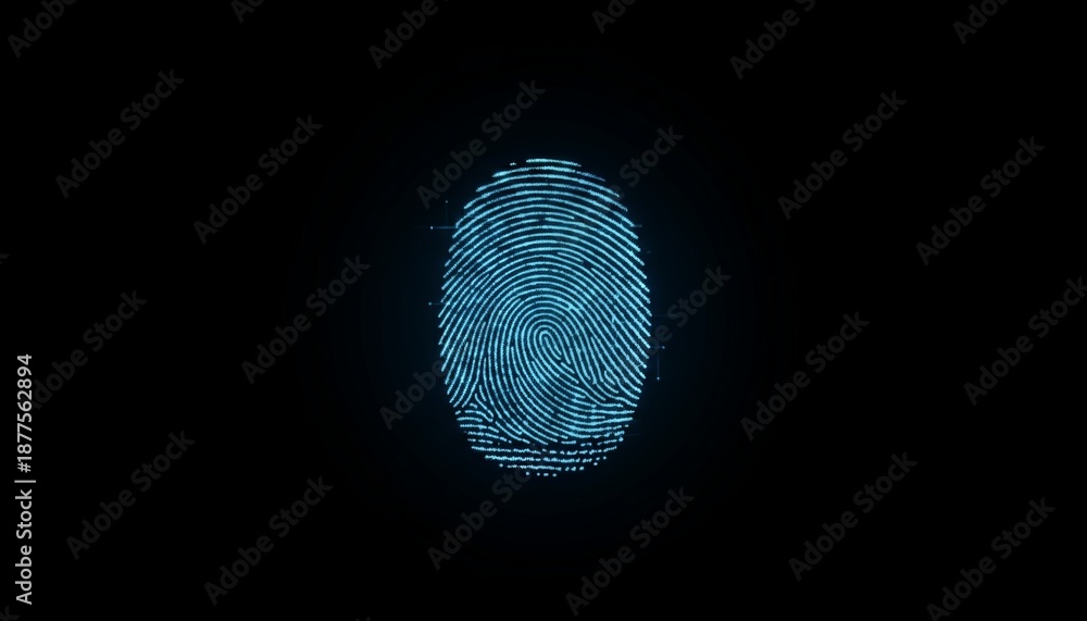 Fototapeta na wymiar - Digital fingerprint graphic illuminating on a black background, representing biometric authentication, personal identity, and advanced security measures for sensitive data and crime investigations.