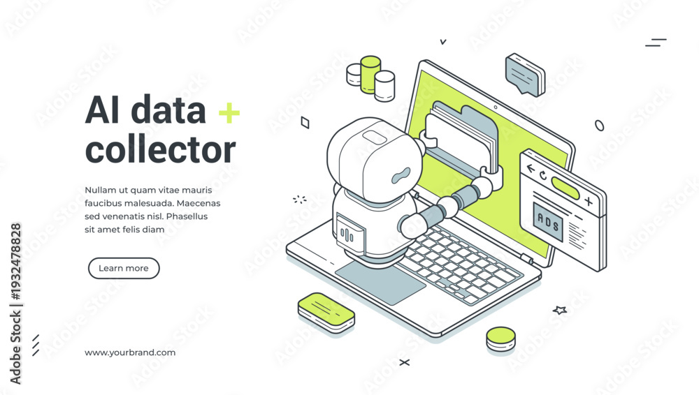 Fototapeta na wymiar - AI data collector isometric banner template. Vector illustration for a landing page with a robot gathering data. Modern technology concept for information mining, analysis, and business automation.