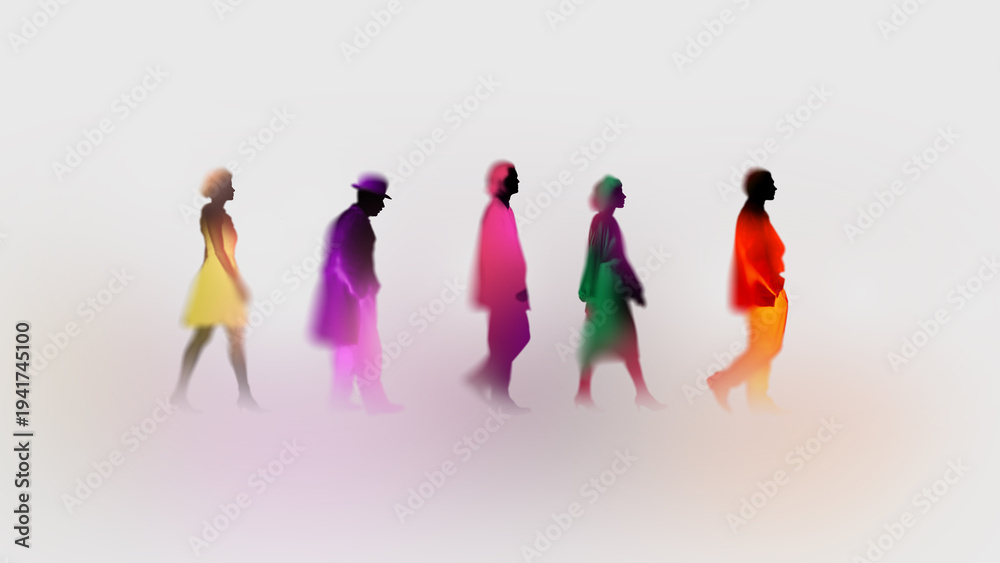 Fototapeta na wymiar - People silhouettes walking in colorful blur gradient light effect. Visual for urban lifestyle, social themes, diversity campaigns and modern advertising design..