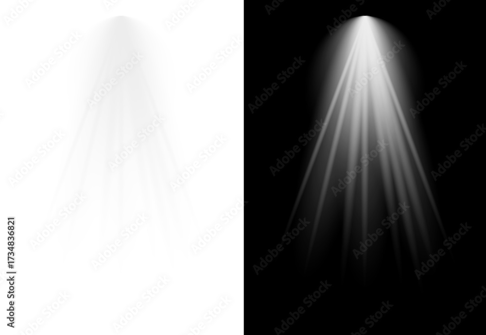 Fototapeta na wymiar - Realistic transparent spotlight effect. A bright, glowing light beam with rays. PNG design element for stage, studio, or gallery illumination..