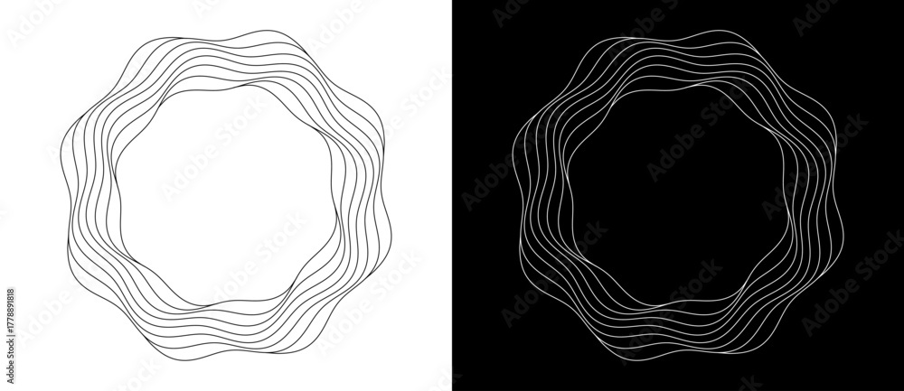 Fototapeta na wymiar - Circle with wave lines as dynamic abstract vector background or logo or icon. Flower concept. Black spiral on white background and white spiral on black background..