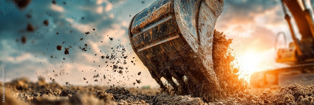 Fototapeta na wymiar - A large black shovel is digging into the dirt, leaving a cloud of dust in its wake..