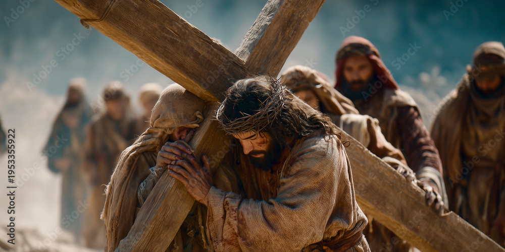 Fototapeta na wymiar - Simon of Cyrene Helping Jesus Carry the Cross on the Road to Calvary.