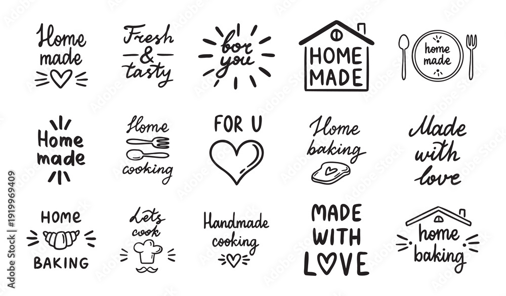 Fototapeta na wymiar - Home cooking, home baking or made with love, old style kitchen lettering, food and cooking set. Home made doodle simple ink or pen outline emblems.