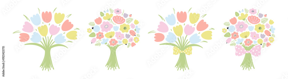 >Fototapety na wymiar>Wybrane motywy - zobacz więcej !>Ptaki>Bouquet of spring flowers, tulips isolated illustration set. Pastel blossoms, blooms, florals. Easter holiday clip art collection, seasonal card, banner, poster. Hand drawn flat vector design element