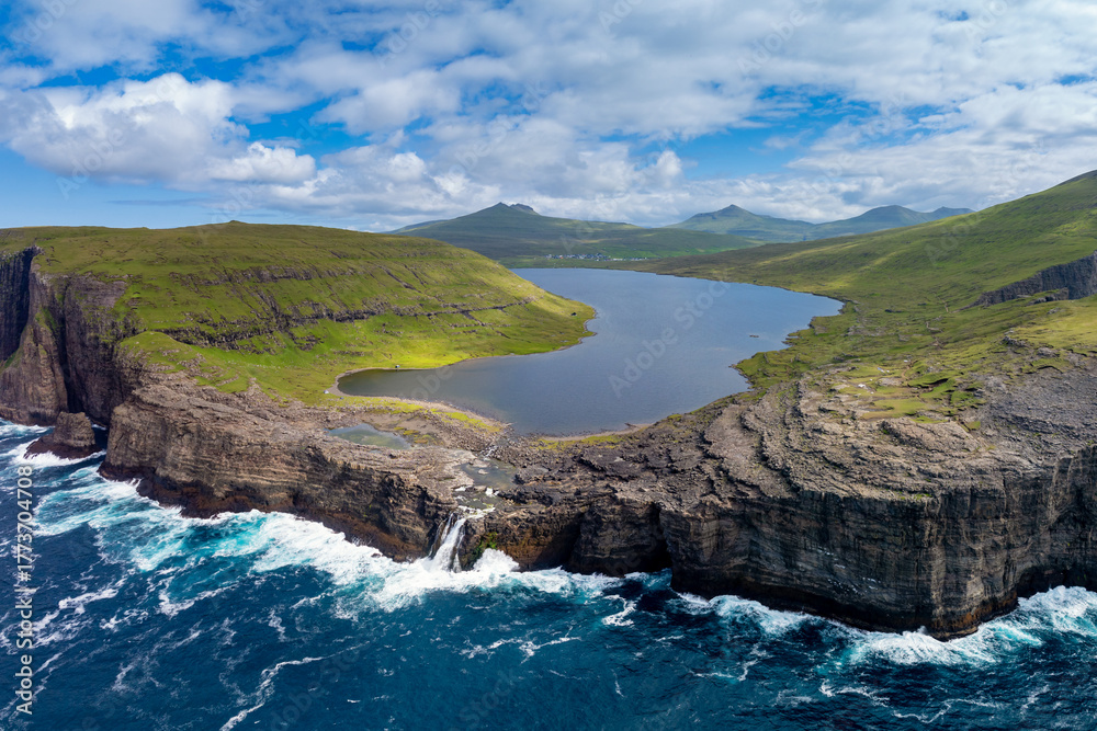 Fototapeta na wymiar - aerial view of Sorvagsvatn Lake and Bosdalafossur Waterfall on Vagar Island in the Faroe Islands.
