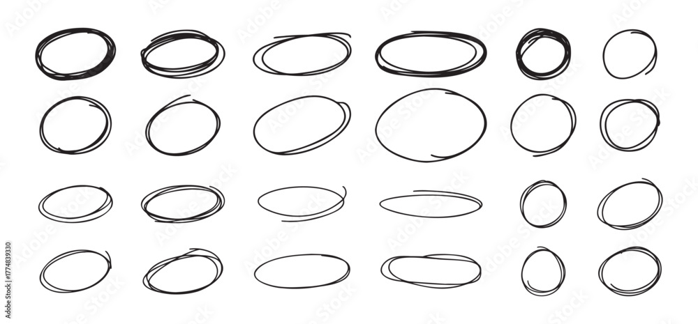 Fototapeta na wymiar - Highlight oval circle hand drawn doodle frames. Free pencil round lines. Round brush mark..