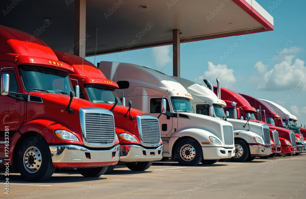 >Fototapety na wymiar>Wybrane motywy - zobacz więcej !>Pustynia>Many semi trucks stand in row at gas station. Commercial transport vehicles waiting for refuelling in stopover. Cargo logistic automobile fleet parked under roof. Trucking industry. Road transport